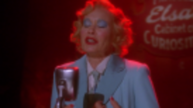 When the camera moves, during Lange's performance above, to this "sad-clown" version of Elsa in the audience, it's contrasting her visually with the complicated, weeping freakazoid Dandy Mott, who can't seem to separate his adoration from his prurience from his fascination with the freaky. That's no accident. While the story has other plans for Dandy, it's an important point for the show to make as early as possible: Just because you're on the Inside of the Out Crowd doesn't mean you're not benefiting from the structural iniquities that surround us all, nor does it mean you aren't, on some level, taking a vacation in someone else's story.
