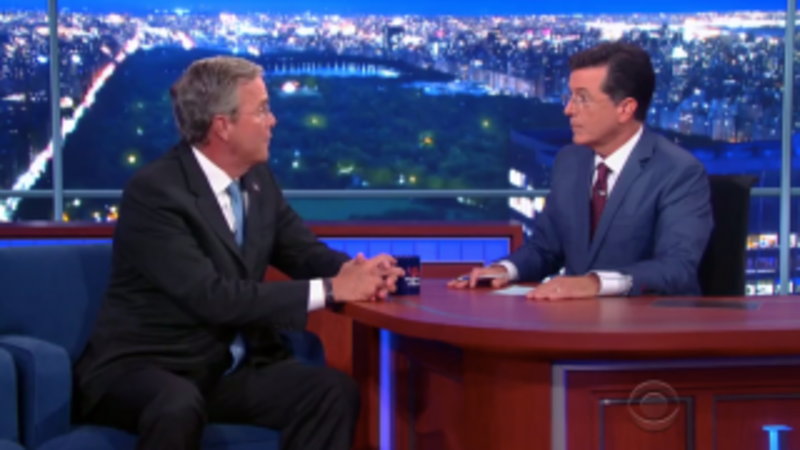 This should have been a perfect opportunity for Colbert to ask Bush about Donald Trump, who has been hounding Bush relentlessly as their poll numbers drive in opposite directions. Hours before the taping of last night’s episode, Trump released a mock infomercial that made fun of Bush for having an audience member fall asleep behind him during a recent campaign stop. If there’s a single thing interesting about the Jeb Bush campaign it’s this dynamic, but Colbert quickly shuffled off the subject for a rehearsed bit about Colbert’s family that culminated in him asking Bush how he was different from his brother.